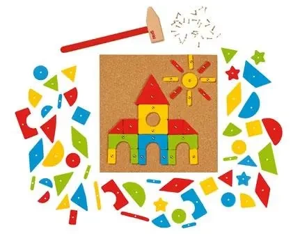 Wbijanka Goki to idealny sposób na rozwijanie wyobraźni i kreatywności dzieci dzięki układaniu różnych kształtów na korkowej planszy. W zestawie znajduje się 118 kolorowych elementów do tworzenia obrazków według własnych pomysłów. Wbijanka Goki to zestaw składający się z korkowej planszy, kolorowych figur z otworami, metalowych pinezek do mocowania na planszy i drewnianego młotka. Dodatkowym urozmaiceniem są karty z różnorodnymi wzorami, którymi można inspirować się tworząc własne kompozycje. Wykorzystanie młotka do przybijania elementów na planszy pozwoli dzieciom na rozwinięcie sprawności manualnej oraz koordynacji ręka-oko. Wbijanka Goki to nie tylko zabawa, ale przede wszystkim aktywność twórcza, stymulująca rozwój dziecka na wielu płaszczyznach. Kreatywna zabawka Goki dostarczy wiele radości młodym artystom, a dzięki wysokogatunkowym materiałom, z których została wykonana, spełni oczekiwania nawet najbardziej wymagających rodziców.EAN: 4013594585781