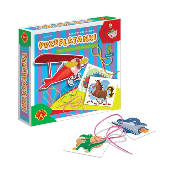 Przeplatanki Chłopiec ALEX to świetna zabawka dla dzieci, która polega na przenoszeniu kolorowego sznurka przez otwory umieszczone na tabliczkach z obrazkami. Dzięki niej dzieci mogą rozwijać swoją zręczność, cierpliwość oraz precyzję. Przeplatanki są również doskonałym rozwiązaniem do nauki wiązania butów czy kokardek. W zestawie znajduje się 8 różnych tabliczek z otworami do przeplatanie sznurków.