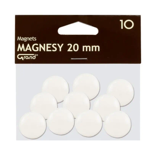 To zestaw 10 praktycznych magnesów o średnicy 20 mm, z których każdy jest umieszczony w białej, plastikowej obudowie dla łatwego uchwytu i trwałości. Idealne do szybkiego przyczepiania papierów, zdjęć czy kartek z ważnymi notatkami na magnetycznych tablicach czy lodówkach.