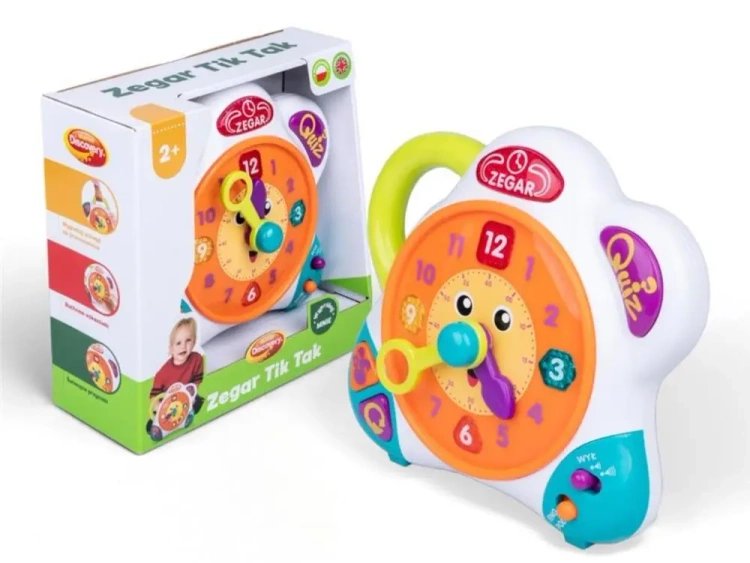 Zabawka posiada również wesołe melodie i kolorowe, świecące przyciski, które dodatkowo zachęcają do dalszej eksploracji i zabawy. Zegar wyposażony jest w praktyczny uchwyt do przenoszenia, dzięki któremu Twoje dziecko może zabrać go ze sobą w dowolne miejsce.