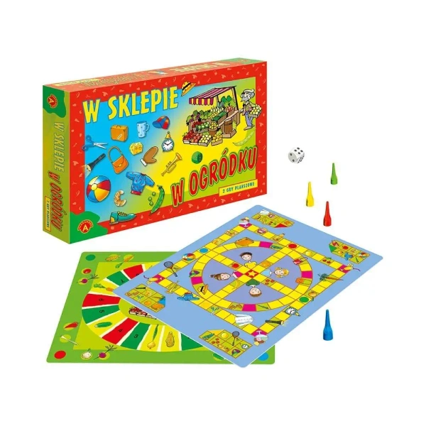 "Prowadzenie własnego ogrodu ma swój urok, szczególnie kiedy przychodzi czas na żniwa. W grze "W ogródku", gracze stają się ogrodnikami, którzy zebrali plony po długim okresie ciężkiej pracy w ogrodzie. Jest to moment na sprzedaż owoców naszej pracy na straganie. Ale bądź na guardzie! Czeka tu na Ciebie wiele niespodzianek. Zwycięża ten, który jako pierwszy zgromadzi 4 skrzynie zróżnicowanych warzyw. Jeśli zakupy są Twoją pasją, pokochasz grę "W sklepie". Celem jest zakup siedmiu różnych artykułów, z tym, że każdy gracz dąży do nabycia innej kombinacji. Kto najszybciej zakończy zakupy, wygrywa. Czy jesteś gotowy na ekscytującą rywalizację w handlowaniu i ogrodnictwie?Co znajduje się wewnątrz opakowania?