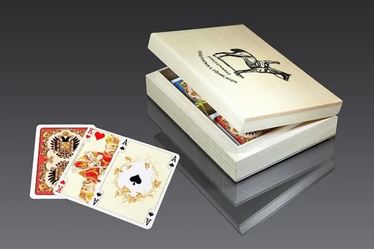 Odkryj niepowtarzalny komplet kart kreowany przez uznawaną markę Ferd. Piatnik & Sohne. W skład zestawu wchodzi przechowywana w eleganckim, drewnianym pudle z uwypuklonym logo Piatnika, para talii "Kaiser". Wyróżniający się design tego specyficznego modelu jest zasługą Piatnika i od wielu lat przyciąga uwagę graczy, przede wszystkim w Galicji. Niecodziennym elementem są obrazy cesarskiej dynastii Habsburgów na awersie kart. Istotnym elementem jest nie tylko elegancki wygląd rewersów, ale również ich symetria oraz unikalne, odmienne wzory. Odpowiada to na potrzeby każdego gracza, od mniej doświadczonego po bardzo zaawansowanego.Każda z talii zbudowana jest z 55 kart, pokrytych powłoką plastikową, o gramaturze 310. Są one nieco większe od standardu, z wymiarami 62 x 91 mm. Idealnie pasują do takich gier jak brydż, poker, remik i wiele innych. Produkty z wiedeńskiego zakładu Ferd. Piatnik & Sohne od 1824 roku imponują różnorodnością wzorów i najwyższym poziomem wykonania. Gwarancją ich jakości są tradycja i wieloletnie doświadczenie.