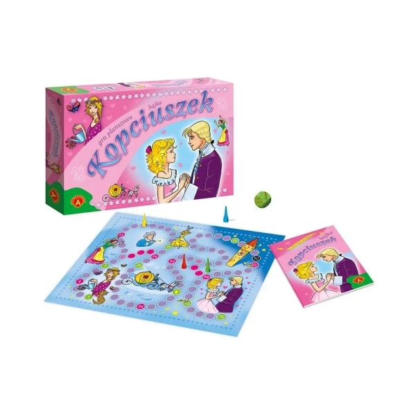 Zabierz się w fascynującą podróż do świata bajek i doświadcz niesamowitych przygód wraz z Kopciuszkiem. W tej grze twoje działania i decyzje są kierowane przez rzuty kostką, która może zaproponować Ci zadania spowalniające twój marsz, ale również zaskakujące niespodzianki, które ułatwią Ci drogę. Zwycięzcą zostaje ten, kto pierwszy dobiegnie mety i zdobędzie serce księcia. Na dodatek do gry dołączona jest mała książeczka z bajką. W skład zestawu wchodzą:- plansza do gry,