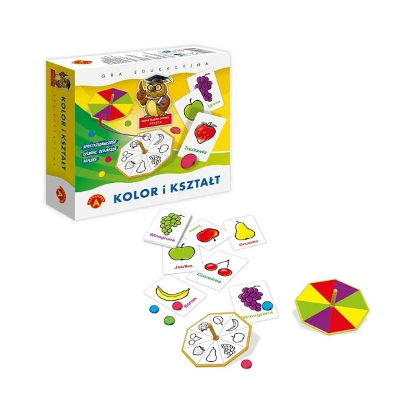 "Kolor i kształt" to emocjonująca gra, której celem jest jak najszybsze dopasowanie kolorów do kształtów owoców. Ten prosty w założeniach stawia wyzwanie nie tylko dzieciom, ale również dorosłym, którzy mogą sprawdzić swój refleks i spostrzegawczość. Gra dostarcza niesamowitych emocji i jest doskonałym treningiem umiejętności.Zestaw składa się z 15 kart przedstawiających owoce, 2 bączków, 24 żetony oraz instrukcji. Jest przeznaczona dla 2-4 graczy, którzy ukończyli 5 rok życia.