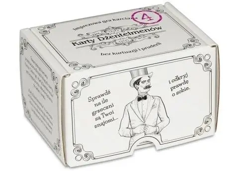 Z radością prezentujemy długo oczekiwany Epizod Czwarty gry karcianej Karty Dżentelmenów! Teraz możesz pożegnać nieaktualne metody spędzania czasu (tutaj wymyślony emotikon wydawcy odpowiadający za humorystyczną aluzję, nie bierzemy odpowiedzialności). Podstawowa zawartość opakowania obejmuje 220 starannie przygotowanych kart. Wśród nich znajdziesz: - 50 nowoczesnych Czarnych Kart pytań zróżnicowanych tematycznie i nastrojem, - 155 świeżych Białych Kart odpowiedzi dostarczających mnóstwo możliwości i zabawy, - 15 kart do samodzielnego wypełnienia (5 Czarnych i 10 Białych), dzięki którym wprowadzisz własne pomysły do gry. Dodatkowym atutem jest pełna kompatybilność z poprzednimi edycjami gry, co pozwala na tworzenie nieskończenie licznych i fascynujących kombinacji. Nie czekaj, ciesz się niepowtarzalnym urokiem Epizodu Czwartego Karty Dżentelmenów już dziś!EAN: 5905669520041
