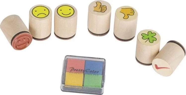 Produkt obejmuje 7 stempelków z różnymi wzorami, takimi jak buźka uśmiechnięta, buźka smutna, buźka poważna, kciuk do góry, kciuk do dołu, koniczynka oraz ptaszek odznaczenia. Dodatkowo, zestaw zawiera tuszownik w czterech kolorach: żółtym, pomarańczowym, niebieskim oraz zielonym. Dzięki różnorodności wzorów i kolorów, dzieci mogą wyrażać swoje emocje i przekazywać informacje, jednocześnie ucząc się współpracy i kształtując swój własny styl.