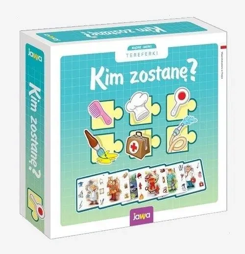 Zestaw "Kim zostanę?" to edukacyjna gra typu układanka składająca się z 6 plansz, które przedstawiają różne profesje, takie jak: Policjant, Strażak, Malarz, Lekarz, Kucharz, Fryzjer.Do każdej z nich dołączane jest 6 atrybutów w formie puzzli, które w sposób bezpośredni łączą się z wartościami i atrybutami reprezentowanymi przez dany zawód.