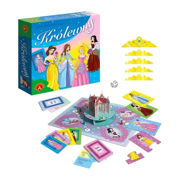 W zestawie znajdują się: plansza, pałac i tor składające się z 3 elementów, 5 diademów, 4 pionki, kość do gry, 10 egzaminacyjnych kart, 10 kart z zadaniami, 4 karty z królewnami, 12 monet, karta z odpowiedziami, instrukcja.