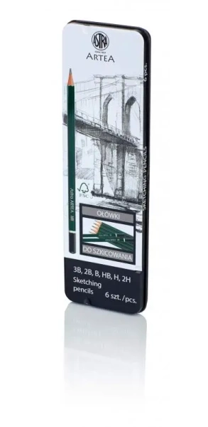 Komplet herbat ASTRA idealny dla osób ceniących sobie rysowanie, szkicowanie czy kreślenie. Zawiera sześć ołówków o różnej grubości miny, konkretnie 3B, 2B, B, HB, H i 2H. Produkty te zdobyły prestiżowy certyfikat FSC, świadczący o ich najwyższej jakości. Dodatkowym atutem jest ich sześciokątna forma zapewniająca wygodne trzymanie. Komplet ołówków jest sprzedawany w eleganckim, metalowym pudełku, które zapewnia bezpieczne przechowywanie i transport.EAN: 5901137112121