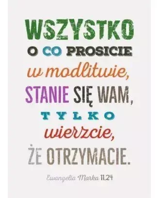 Kartka składana, dodatkowo zaopatrzona w kopertę, idealnie nadaje się na prezent lub podziękowanie. Kluczowym elementem jest zawarty na niej cytat: Ewangelia Marka 11,24.Personalizacja tekstu