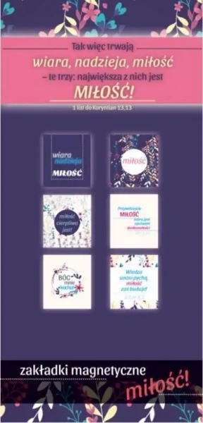 Mamy tu do czynienia z unikalnym zestawem magnetycznych zakładek książkowych, które zostały ozdobione Słowem Bożym. Komplet zawiera sześć kunsztownie wykonanych sztuk.