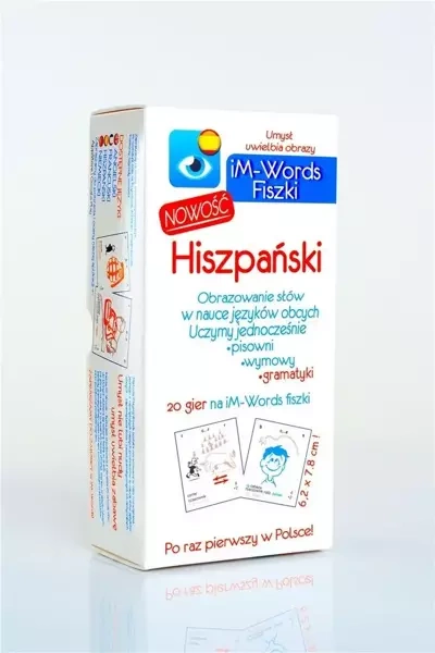 Każda fisz-karta (fiszka) posiada obrazek iM-Words, który uczyni twoją naukę kolorową i jeszcze bardziej zajmującą. Dzięki temu iM-Words fisz-kartami można grać jak w karty. Górny rząd liter wskazuje, jak zgodnie z zasadami gier iM-Words dobierać i grać fisz-karty iM-Words czyniąc naukę jeszcze bardziej zajmującą.Każdy awers dodatkowo posiada oznaczenie języka, dzięki temu może uczyć się nie tylko jednego języka, dodatkow urozmaicając sobie naukę. A oprócz tego: Każda iM-Words fisz-karta jest zrobiona z wysokiej jakości papieru kredowego i o dużym rozmiarze 7,8 x 6.2 cm! Dzięki temu masz większy komfort nauki Język hiszpański: Każdy zestaw składa się z: 300 kolorowych fisz-kart z obrazkami iM-Words opis metody iM-Words pudełko do iM-Words fisz-kart zasady 20 gier iM-Words pionki, kostka, specjalny fisz-karty do gier