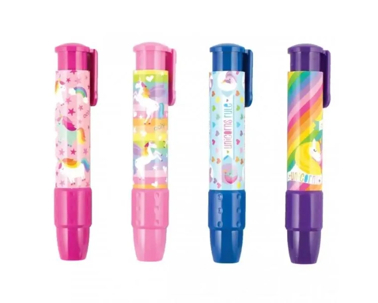 Jednorożce na tych mechanicznych gumkach sprawią, że nawet najbardziej błędne rysunki i notatki zostaną poprawione w magiczny sposób. Każda gumka znajduje się w plastikowej oprawie, dzięki czemu korzystanie z niej jest niezwykle łatwe. Wystarczy kilka kliknięć, aby móc cieszyć się czystym i przejrzystym papierem.Dostępne w 4 stylach i kolorach