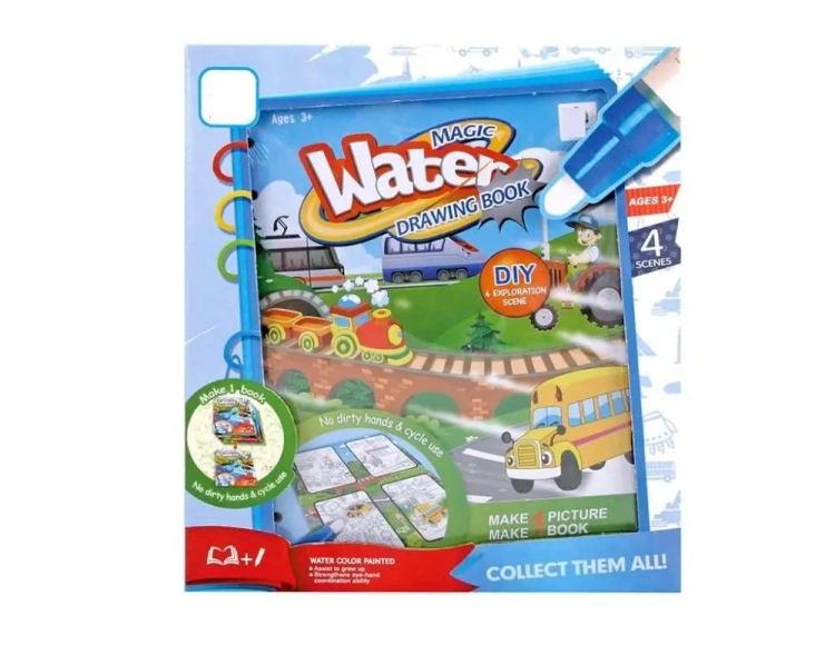 Ożyw swoją wyobraźnię dzięki książeczce z wodnym pisakiem. Ta niezwykła zabawka umożliwia stworzenie własnymi rękoma czterech oryginalnych obrazków z pojazdami. Bez żadnego bałaganu i bez potrzeby dodatkowych narzędzi.Jak to działa?