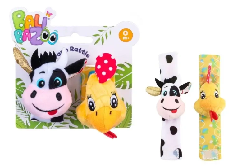Krówka i kogucik to dwa przyjacielskie stworzenia, które uwielbiają wspólnie spędzać czas, dzieląc się swoimi opowieściami oraz grzechotkowymi dźwiękami. Swoje miejsce na rączke malucha znajdują dzięki praktycznym paseczkom wyścielanym miękkim materiałem, które zapinają się na rzep. Dzięki temu mogą być z dzieckiem zawsze, kiedy tylko jest ochota na wspaniałą, wspólną przygodę w odkrywaniu coraz to nowszych, cudownych miejsc.