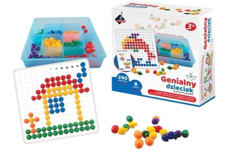 Kreatywne grzybki to świetna zabawka edukacyjna, która stymuluje motorykę małej ręki, poprawiając zarówno sprawność dłoni, jak i paluszków. Dzięki niej, dziecko ma okazję bawić się, odkrywać i uczyć jednocześnie, kreując swoje własne obrazki.