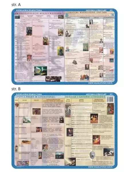 Podkładka edu-051 to wyjątkowa pozycja dla każdego miłośnika literatury, która przybliża czytelnikowi najważniejsze tematy związane z literaturą 20-lecia międzywojennego oraz współczesną. Dzięki niej można się również dowiedzieć wiele interesujących informacji na temat epok i prądów literackich.Epoki i prądy w literaturze