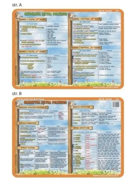 Podkładka edukacyjna edu-010 od Visual System to doskonałe narzędzie wspomagające naukę pisowni dla uczniów różnych grup wiekowych. Pozwala na opanowanie pisowni z cząstką -by, jak również z partykułą nie, co stanowi jedne z najczęściej popełnianych błędów ortograficznych. Zawiera także informacje i przykłady dotyczące tworzenia wyrazów pochodnych, opisujące rodzaje formantów oraz wyrazy złożone, co ułatwia zrozumienie procesów tworzenia słów. Ponadto podkładka edukacyjna prezentuje rodzaje zapożyczeń oraz ich wpływ na pisownię, co jest szczególnie przydatne dla uczących się języka polskiego. Podkładka edu-010 Pisownia z by i nie Visual System to praktyczna pomoc edukacyjna, która wspiera proces nauki pisowni, a jednocześnie jest wygodna w użyciu i łatwa do zrozumienia.EAN: 5903111525101