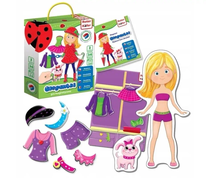 Gra Magnetyczna "Elegantki" to zestaw magnesów 3D, które gwarantują niekończące się godziny zabawy dla młodych miłośników mody. Dzieci mogą zestawiać magnetyczne elementy na dołączonej do zestawu tablicy lub dowolnej magnetycznej powierzchni. Większość dziewcząt uwielbia bawić się swoimi lalkami, dobierając im różne stroje i tworzyć coś własnoręcznie. Ten zestaw oferuje niezliczone kreatywne możliwości z lalką Alisą i jej pieskiem Polly.