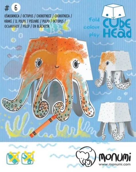 Zaprojektowany dla małych i dużych, model Ośmiornica Cube head to zabawka wykonana z tektury falistej obranej białym papierem. Oferuje idealny sposób na rozwijanie wyobraźni i precyzji manualnej - do wykonania tego modelu nie trzeba używać nożyczek ani kleju, wystarczy składać według instrukcji. Model jest dostosowany do ozdabiania różnego typu narzędziami malarskimi, począwszy od kredek, przez pisaki, a skończywszy na farbach. Papier użyty do produkcji tego modelu jest tak wysokiej jakości, że znakomicie wchłania wodę, nie gniecie się i nie przecieka.Wymiary produktu to 16.5 x 22.0 x 18.0 cm