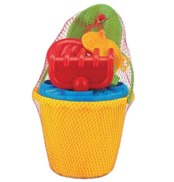 Zestaw składa się z wiaderka, sitka, grabelek, łopatki oraz trzech foremek. Produkty są dostępne w różnych kolorach, które są wybierane i wysyłane losowo.