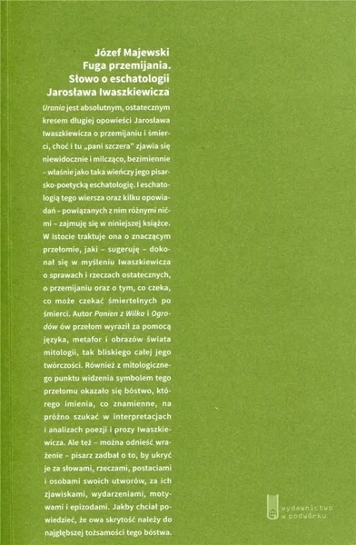 Jarosław Iwaszkiewicz uczynił przemijanie, starość i śmierć jednym z najważniejszych tematów swojej poetycko-prozatorskiej twórczości. Dziwić więc może skromna liczba opracowań dotyczących tej tematyki w polskim literaturoznawstwie. Ową lukę próbuje wypełnić monograficzna rozprawa Józefa Majewskiego. Osią konstrukcyjną jego pracy staje się rozpisana na kilka głosów analiza ostatniego wiersza poety słynnej Uranii; wokół niej autor szkicuje rozległy i szczegółowy pejzaż wątków eschatologicznych stale obecnych w kilkudziesięcioletniej drodze twórczej autora Panien z Wilka i Srnit.