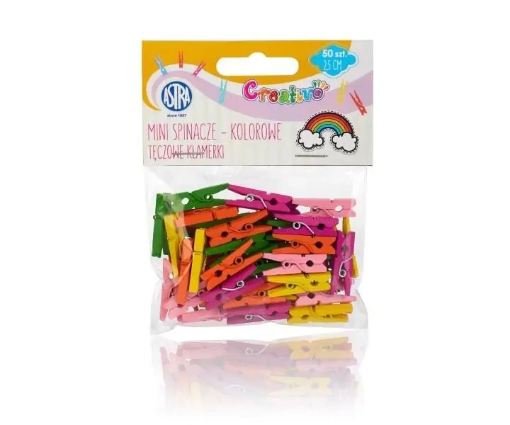 Spinacze drewniane Astra to zestaw 50 sztuk kolorowych, tęczowych klamer, które sprawdzą się w pracy twórczej i dekoracyjnej. Stanowią doskonałe narzędzie w procesie tworzenia różnorodnych dekoracji, kompozycji oraz prac plastycznych.Ozdabianie kartek, zaproszeń i zakładek do książek