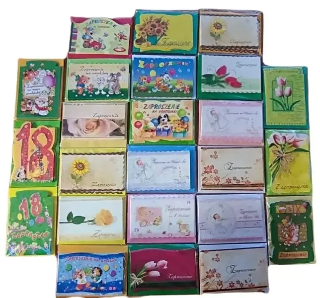 W ofercie znajduje się zestaw, który obejmuje 10 zaproszeń oraz 10 kopert pasujących do nich. Klienci otrzymują zaproszenia z różnorodnymi wzorami - nie ma możliwości wyboru konkretnego motywu, ponieważ wzór jest dobierany w sposób losowy.