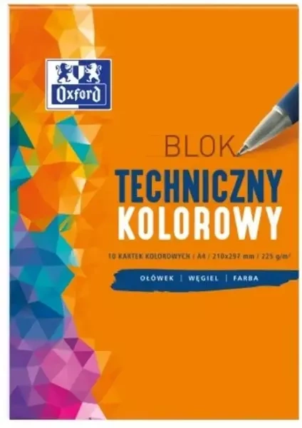 Produkt na fakturze opisany jest jako BLOK TECH.A4/10K KOLOROWY 225G. Jest to zbiorcze opakowanie bloków technicznych.Zalety bloków technicznych Oxford