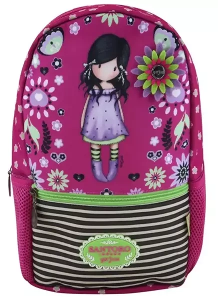 Przykuwający wzrok, zgrabny plecak prezentujący autorską ilustrację Gorjuss. Projekt cechuje się paletą barw, która uwzględnia odcienie magenty, bzu i limonki. Wyposażony w miękkie, regulowane paski do noszenia na plecach zapewniające komfort użytkowania. Znakomitym uzupełnieniem są suwaki z medalionami, które przypominają kształtem starożytne mosiężne monety z delikatnym wizerunkiem dziewczynki Gorjuss. Kieszenie, które są zamykane na suwaki, gwarantują bezpieczeństwo twoich rzeczy. Przestronne wnętrze plecaka jest udekorowane modnymi paskami, tworząc wygodne miejsce na wiele przedmiotów. Duża kieszeń umożliwia przechowywanie większych elementów, a dodatkowo jest łatwo zamykana na suwak. Na zewnątrz znajduje się płaska kieszonka, w której można przechowywać drobne przedmioty na wyciągnięcie ręki. Dodatkowo, po bokach plecaka znajdują się kieszenie z elastycznej siatki, które są bardzo funkcjonalne i praktyczne na co dzień.EAN: 5018997626290