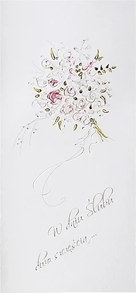 Oferowany produkt jest ręcznie malowanym karnetem, wyrażającym elegancję przy pomocy drobnych elementów. Wykonany na białym papierze, subtelnie wytłoczonej faktury o gramaturze 200 g/m2. Szczegółowe i delikatne wykonanie sprawia, że jest to wyjątkowe i cenne dodatek do prezentu ślubnego.EAN: 5907633401271