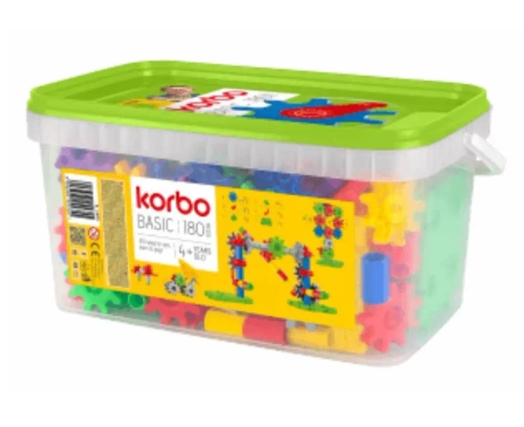 Zestaw klocków Korbo Basic 180 to największa kolekcja z linii Basic, w której znajduje się aż 72 koła zębate oraz 8 podstaw. Różnorodność i wszechstronność części w tym zestawie umożliwia tworzenie nieograniczonych konstrukcji. Do zamkniętej instrukcji dołączono 15 pomysłów na stworzenie różnorodnych projektów o zróżnicowanym poziomie trudności, takich jak żyrafa, kaczka, stonoga, robot, latarnia wodna czy gazociąg.Osiem plansz w dwóch kolorach