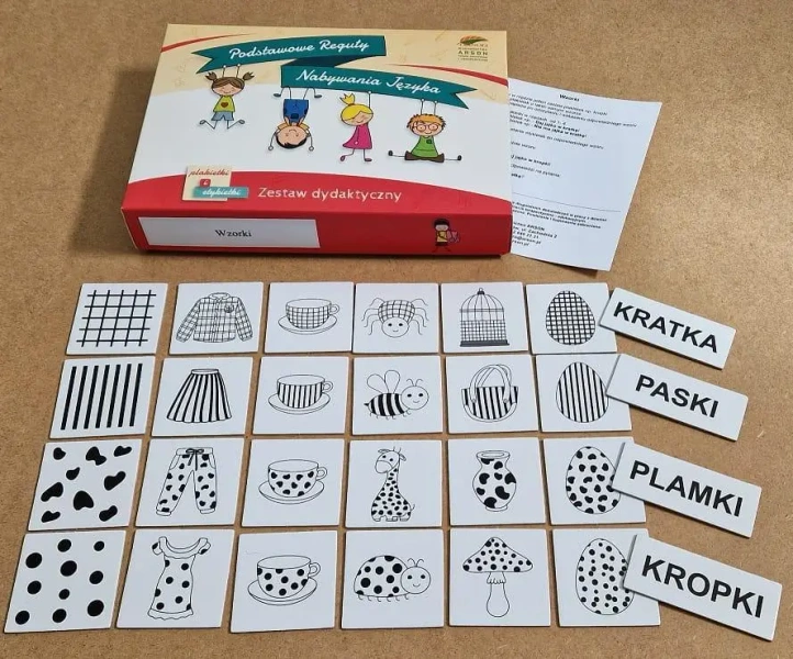Zestaw ten służy do nauki identyfikacji takiego samego wzoru z pominięciem kształtu wypełnionego tym wzorem oraz nauki wypełniania wzorem dowolnych figur. Nauki odpowiedzi na pytanie: Jaki to wzór?