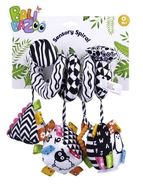 Spirala zawiera różne figury geometryczne takie jak piłka, kostka czy piramida. W ich wnętrzu ukryte są dzwoneczki, które zaciekawią małych odkrywców. Dodatkowo, na piłce zamontowane jest bezpieczne lustereczko, które pozwoli dziecku na lepsze poznanie siebie. A dla maluchów zaczynających ząbkować, dostępne są doczepiane gryzaczki przynoszące ulgę.