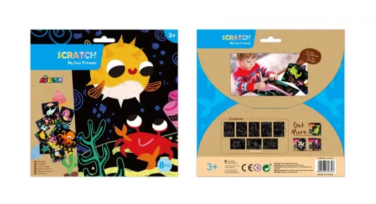 Avenir Scratch nie tylko pozwala tworzyć piękne i kolorowe prace, ale także dostarcza doświadczeń sensorycznych. Używając specjalnego narzędzia do zdrapywania warstwy wierzchniej, dziecko odbiera nowe wrażenia dotykowe, co sprawia, że zabawa jest jeszcze ciekawsza.Komplet zawiera arkusze i patyczek do zdrapywania