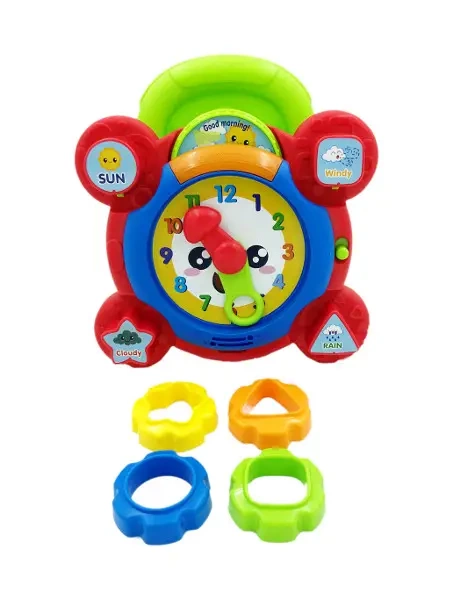 Super zabawka, która przemieni dziecięcą zabawę w naukę i zabawę jednocześnie. "Mój Pierwszy Zegar" SMILY PLAY jest idealnym narzędziem, które nauczy Twoje dziecko rozpoznawania cyfr, godzin jak również różnych kształtów. Wyposażony w obrotową tarczę, która wskazuje na dzień i noc, zegar pomaga maluszkowi zrozumieć jak zmieniają się pory dnia. Dzieci przy przesuwaniu wskazówek usłyszą nie tylko przyjemne tykanie zegara, ale również dźwięki towarzyszące różnym porom dnia - weseli dźwięki towarzyszące dniu oraz odgłosy ziewania, informujące o nadchodzącym czasie snu.Mój Pierwszy Zegar został wyposażony w sorter, na którym widoczne są obrazki prezentujące różne warunki pogodowe. Kiedy maluch poprawnie dopasuje shape, zabawka zagra mu radosną melodię i sprawi, że mrugnie światełko. Zegar SMILY PLAY posiada także wygodny uchwyt, dzięki któremu maluch może zabrać go ze sobą, dosłownie wszędzie. Dzięki temu zabawka stanie się dla maluszka stałym kompanem - nie tylko na czas zabawy, ale również nauki oraz poznawania świata.EAN: 4895038506756
