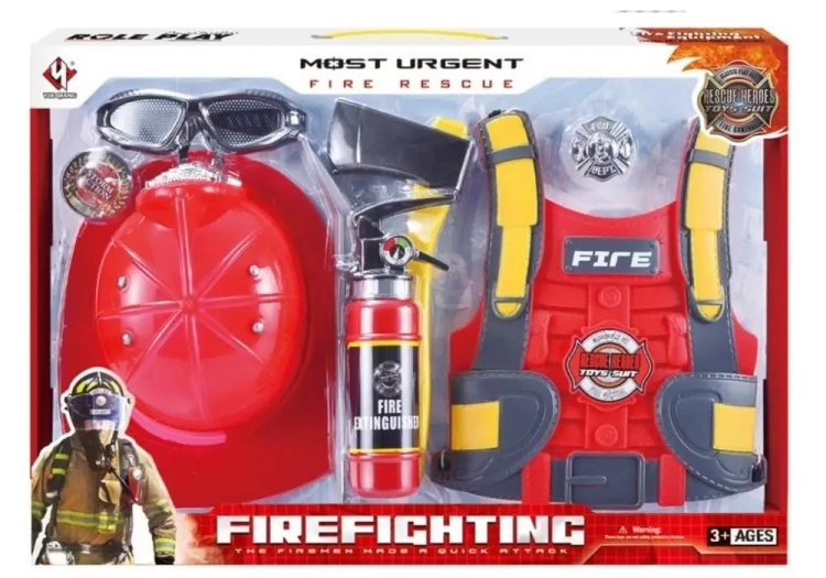 Zestaw zawiera wszystko, czego potrzebuje mały strażak do odgrywania swojej roli. W jego skład wchodzi: - Kamizelka, która ułatwi zrozumienie strażackiego munduru, - Kask ochronny, który doda dzieciom poczucia bezpieczeństwa podczas zabawy, - Siekiera, będąca ważnym narzędziem w pracy strażaka, - Okulary ochronne, które uświadomią dzieciom, jak ważna jest ochrona oczu, - Gaśnica, dzięki której dzieci będą mogły uczestniczyć w wyimaginowanej akcji gaszenia pożarów, - Łom, kolejne niezbędne narzędzie dla każdego strażaka, - Odznaka, pozwalająca poczuć się jak prawdziwy członek straży pożarnej.Nie tylko zabawa, ale także edukacja