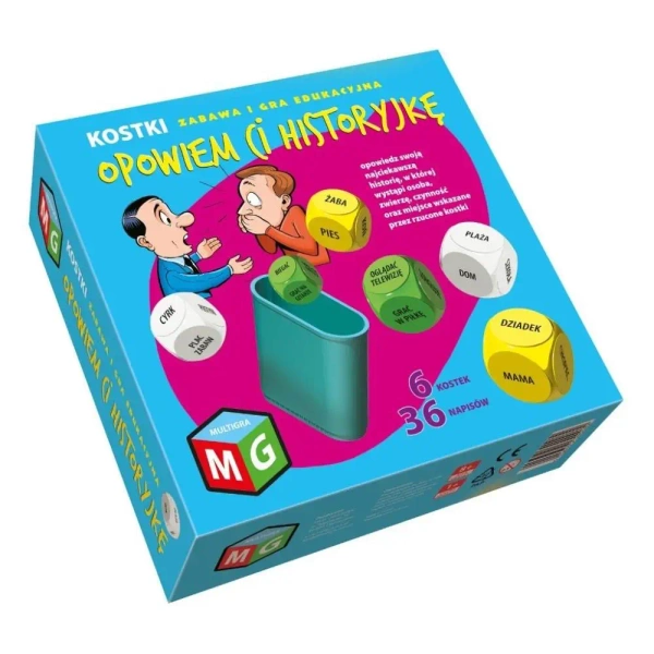 "Opowiem Ci Historyjkę" to edukacyjna gra dla wszystkich, którzy cenią sobie kreatywność i szybkie myślenie. Kostki z wyrazami oferują pełną frajdę i uczenie poprzez zabawę. Zasady są proste - na każdej z sześciu kostek znajduje się określenie dotyczące postaci, zwierzęcia, działania lub miejsca. Zadaniem graczy jest rzucenie kostkami, po czym wymyślenie i opowiedzenie historii, która będzie zawierała wszystkie elementy pokazane na kostkach. Gra "Opowiem Ci Historyjkę" daje możliwość rozwoju dla osób, które uwielbiają tworzyć opowieści, ale także dla tych, którzy chcą nauczyć się pisać szybko i poprawnie. Po rzucie kostkami, gracze muszą jak najszybciej napisać swoją historię, z wykorzystaniem wszystkich słów, które los przyniósł im na kostkach.Zastosowanie dydaktyczne "Opowiem Ci Historyjkę"