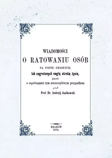 Reprint oryginału z 1870 roku. Książka, która od 1839 roku do końca XIX wieku była obowiązującym tytułem w urzędach powiatowych i gminnych, zakładach leczniczych i farmaceutycznych, jako poradnik do ratowania ludzi. Znajdują się tu informacje odnośnie udzielenia pomocy w razie utonięcia, uduszenia, powieszenia, skaleczenia i otrucia truciznami, a także sposoby na stworzenie antidotum i odtrutek np. w przypadku ukoszeń owadów i innych zwierząt. Dr Andrzej Janikowski był jednym z najwybitniejszych lekarzy medycyny sądowej w XIX wieku. Dzięki niemu powstała Szkoła Farmaceutyczna w Warszawie, w której sam wykładał. Jego prace, głównie z medycyny sądowej, były wysoko oceniane w XIX wiecznej Europie.