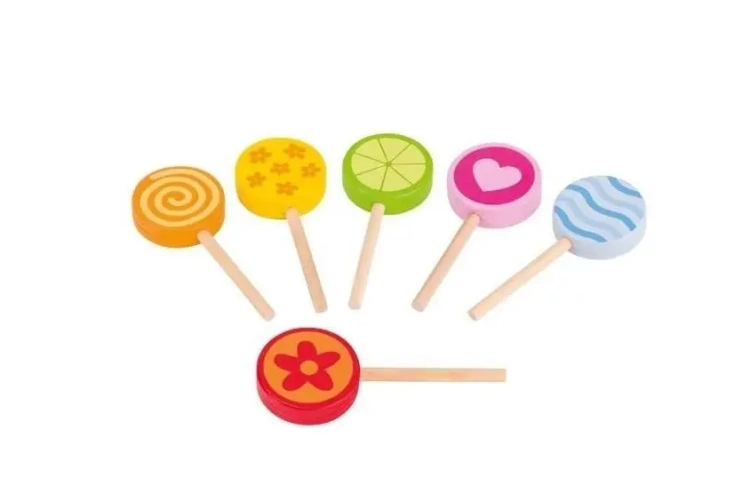 W zestawie znajdują się 6 sztuk kolorowych lizaków, które można używać wielokrotnie. Bez wątpienia jest to zaleta w porównaniu z tradycyjnymi słodyczami – dzieci mogą bawić się nimi bez obawy o przeforsowane zęby czy szkodliwe składniki i używki. Korzystaj z ekologicznego i trwałego materiału, jakim jest drewno.