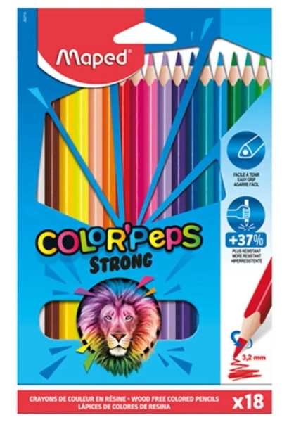 Kredki Color'Peps STRONG to produkty utworzone z innowacyjnej żywicy syntetycznej, co dodaje jakości korpusu – zyskuje on na giętkości i elastyczności. Unikalny, trójkątny, ergonomiczny kształt gwarantuje prawidłowy uchwyt. Zastosowanie mocniej usztywnionego grafitu o przekroju 3,2 mm sprawia, że charakteryzują się zwiększoną odpornością na łamanie i kruszenie. Grafit służący do produkcji kredek Color'Peps okazuje się być o 37% bardziej wytrzymały od tych, które stosuje się w standardowych produktach tej marki. W efekcie na kartce pojawiają się intensywne i pełne nasycenia barwy. Kredki łatwo się temperują – podczas tego procesu nie rozpadają się, nie produkują drzazg. Są bezpieczne dla dzieci – wykonane zgodnie z wszelkimi obowiązującymi normami. Zestaw składa się z 18 kredek, które zapakowano w praktyczne, kartonowe pudełko. Taka oprawa sprawia, że są idealne na prezent dla każdego małego miłośnika sztuki. Dzięki swojej jakości i innowacyjnym rozwiązaniom, kredki Color'Peps STRONG to doskonałe narzędzie dla każdego młodego artysty, którego zaczynają inspirować barwy otaczającego świata.EAN: 3154148627180
