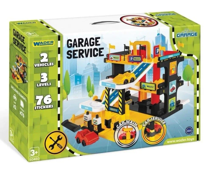 Wszystkie części garażu wykonane są z wysokojakościowego, bezpiecznego dla dzieci i trwałego materiału, co sprawia, że zachowują swoje kształty i kolory przez długie lata. Cały zestaw składa się z różnokolorowych, łatwych w montażu elementów, umożliwia tworzenie wielopoziomowego garażu o wysokości 36 cm. W skład zestawu wchodzi: winda do transportu samochodów na dowolny poziom, rampa, myjnia samochodowa, dystrybutor paliwa, serwis samochodowy, liczne dekoracje oraz 2 autka oraz naklejki. Komplet zapakowany jest w estetyczne pudełko, idealne na prezent.