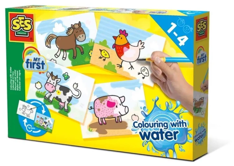 Odkryj magię malowania wodą bez potrzeby porządkowania ze wspaniałym zestawem SES! Za pomocą mokrego pędzelka ożyw kolory na obrazkach z sympatycznymi zwierzętami takimi jak krówka czy świnka. Baw się bezpiecznie, ponieważ pędzel nie traci włosia podczas użytkowania. Możesz też cieszyć się tym zestawem wielokrotnie, gdyż obrazki wracają do stanu pierwotnego po wyschnięciu.