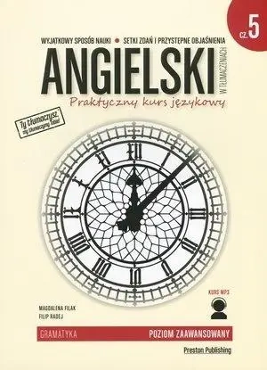 Książka do angielskiego, część piąta z serii Angielski w tłumaczeniach. Gramatyka. Z książki najbardziej skorzystają ci, którzy pragną nauczyć się płynności porozumiewania się i ćwiczyć bardziej skomplikowane struktury językowe na poziomie C1. Skorzystają z niej zarówno uczniowie przygotowujący się do matury, studenci, jak i osoby dorosłe.