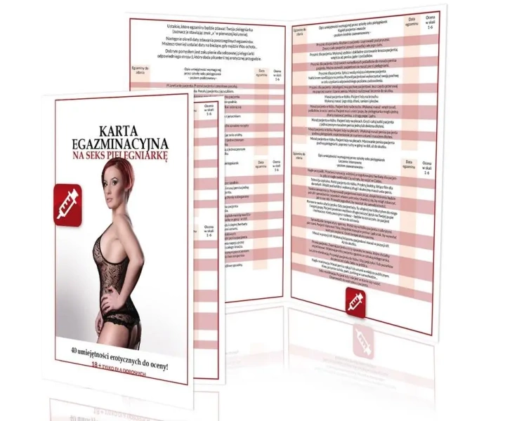 Karta egzaminacyjna na seks pielęgniarkę to seksowna przygoda, w której jeden z partnerów przyjmuje rolę pacjenta-egzaminatora, a drugi staje się pielęgniarką. Pielęgniarka, która jest pomocna i empatyczna, poddaje się egzaminowi przeprowadzanemu przez swojego pacjenta, który posiada listę wymaganych umiejętności seks pielęgniarki. Kolejność wykonywania zadań egzaminacyjnych i ocena pielęgniarki zależy wyłącznie od egzaminatora. Zachęcamy partnerkę do poprawienia swojego wyniku, jeżeli ocena byłaby niska. Dla jeszcze większej przyjemności, sugerujemy podarowanie partnerce odpowiedniego stroju.