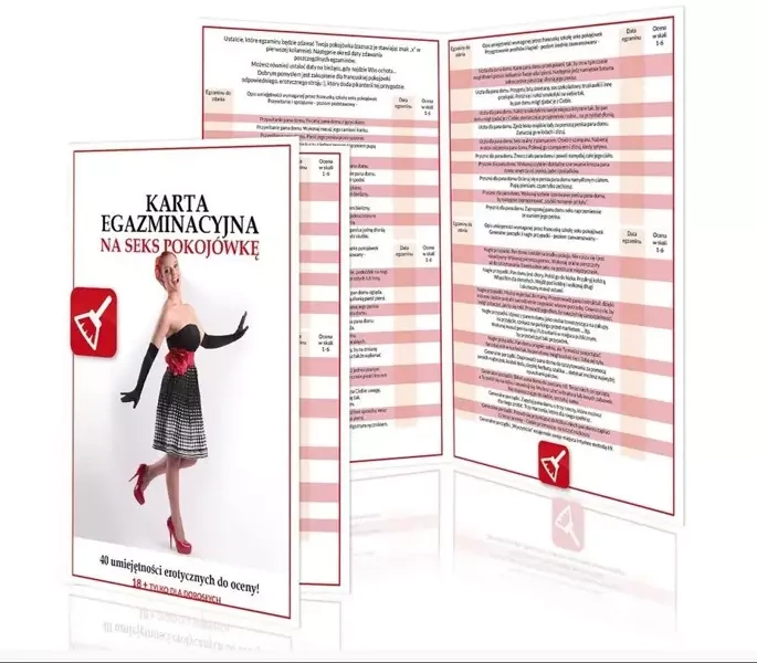 Egzaminacyjna Karta na Seks Pokojówkę przeniesie Was w podróż erotyczną, gdzie jeden z partnerów bierze na siebie identyfikację gospodarza domu, pełniącego rolę egzaminatora, zaś druga osoba staje się pokojówką. Uległą i uwodzicielską pokojówką, która zostaje postawiona przed obliczem egzaminującego, posiadającego listę umiejętności, które są obligatoryjne dla profesji seksualnej pokojówki, jak podaje oficjalny program nauczania. To na egzaminatorze spoczywa decyzja w jakiej kolejności będą zrealizowane zadania egzaminacyjne. Następnie wystawia on pokojówce oceny. W sytuacji, gdy nota wynikowa będzie niska, partnerka może podjąć próby polepszenia jej, co gorąco rekomendujemy. Dodatkowo, sugerujemy wręczenie partnerce specjalnie dobranego stroju pokojówki, co dodatkowo podkreśli urok tej zabawy.
