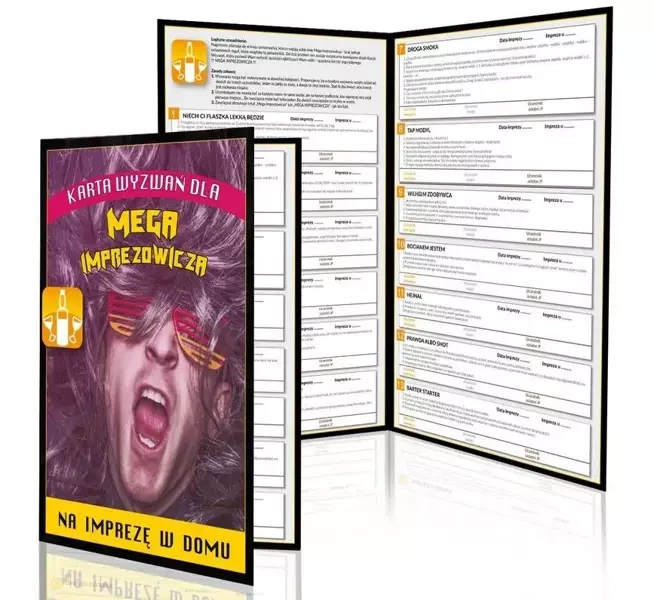 Karta wyzwań została stworzona z myślą o prawdziwych duszach towarzyskich, ceniących sobie wesołe rywalizacje i dobrą zabawę. Wszystko po to, aby móc wyłonić tę jedyną, niepowtarzalną osobę, która zasługuje na miano MEGA IMPREZOWICZA.