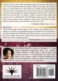 A HOUSE IN ITS HUNGER is a collection that grapples with the intimacy of relationships behind closed doors. In this stunning debut, Jennifer Steele cleverly explores the complexities of the body as a dwelling and the compilation of emotional experiences it consumes and harbors over time. At its core, this suite of 13 poems is a house and also a body under renovation, one constantly shifting between acceptance and resistance of the type of depredation that often leaves one feeling like a guest in one’s own body.