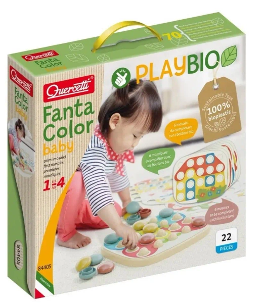 Fantacolor Baby to innowacyjna zabawka edukacyjna dedykowana dzieciom, która pozwala na tworzenie zachwycających mozaik z kolorowych elementów. Zawdzięcza to specjalnej przezroczystej płycie, która ułatwia dopasowywanie dużych kołeczek do odpowiednich kolorów na wzorze umiejscowionym pod spodem. W trakcie zabawy, dzieci mają możliwość rozwijania kreatywności, doskonalenia koordynacji wzrokowo-ruchowej, poznawania barw oraz ćwiczenia zdolności manualnych i chwytania.Playbio - ekologiczna seria produktów Quercetti dla świadomych rodziców