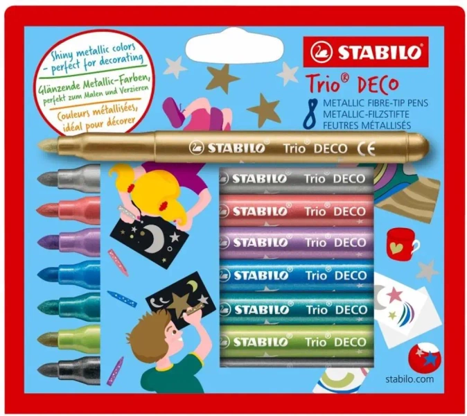 Flamastry metaliczne STABILIO Trio Deco to produkt dedykowany zarówno dla dzieci, jak i dorosłych. Z biegiem lat, to narzędzie piśmiennicze stało się niezastąpione w rękach artystycznych zachwytów, zarówno młodych, jak i starszych fanów kreatywnego tworzenia.